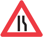 Narrowing road on left side. If the warning only applies to users of cycle tracks this is indicated on the plate below the sign.